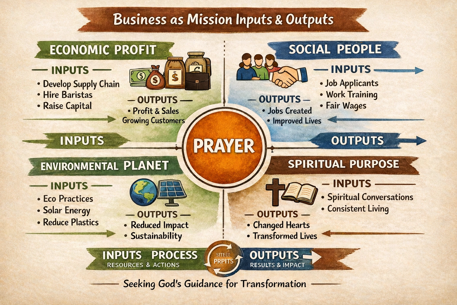 In relation to a study of Inputs and Outputs; inputs are things we can control. We do inputs so that the output results. In the Purpose category, we also control inputs, but we cannot control outputs in the same sense that we can control the income statement or the workers on the payroll, etc. That depends on someone outside of us, and that is where prayer comes in – where dependence on God is essential. That is why an IBEC graphic of our coaching process places prayer at the center of it all.